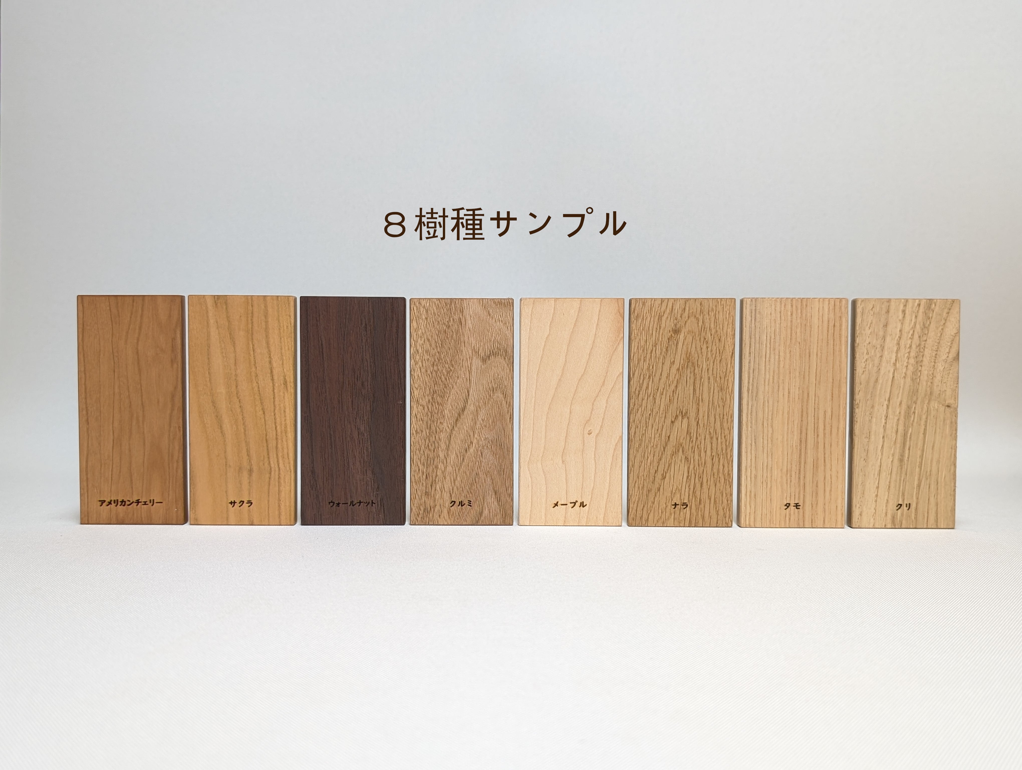 木の種類はアメリカンチェリー・サクラ・ウォールナット・クルミ・ナラ・メープル・タモ・クリの8種類。