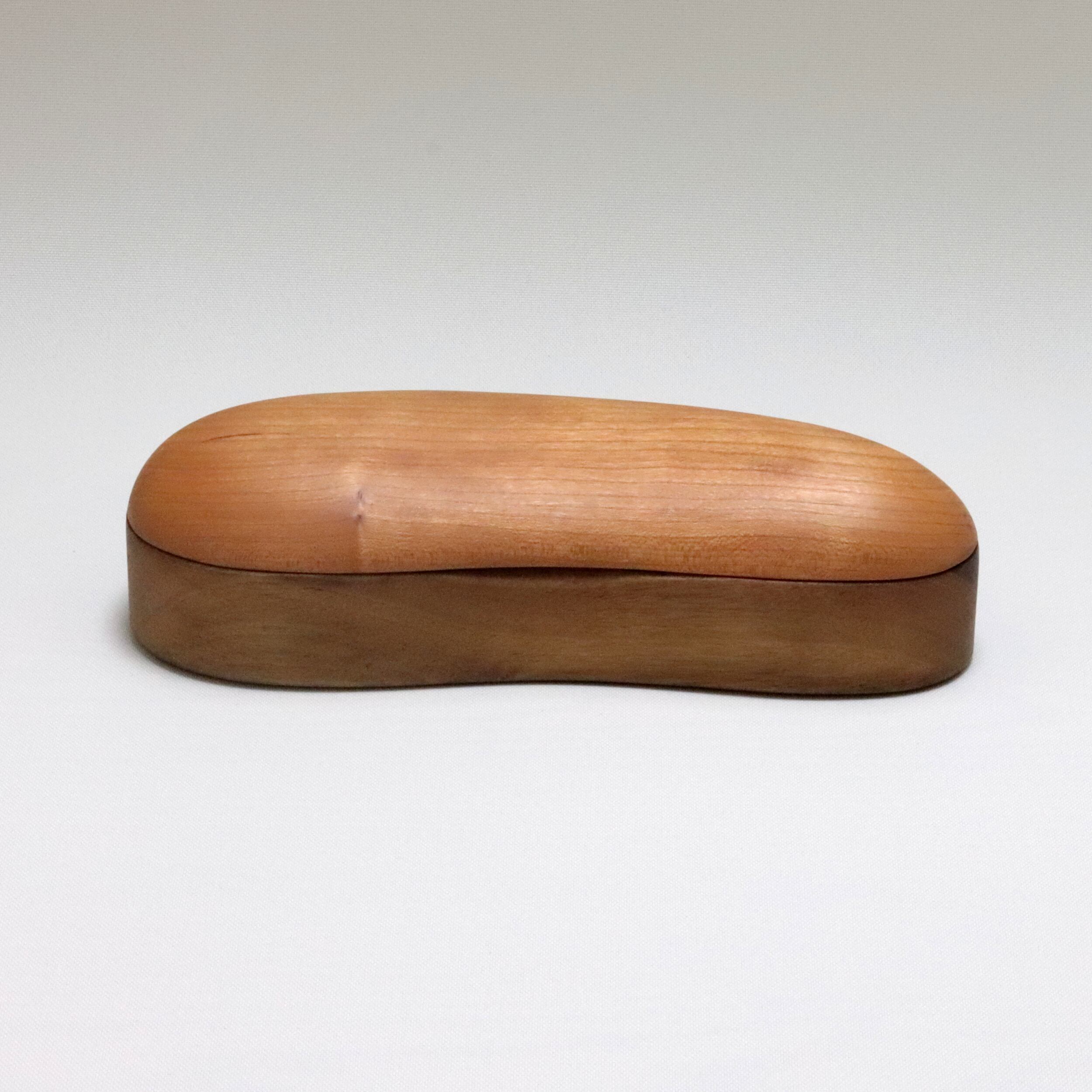 木の塊から作った豆型の小箱「ビーンズ」。柔らかい曲線が手になじみむ小物入れです。