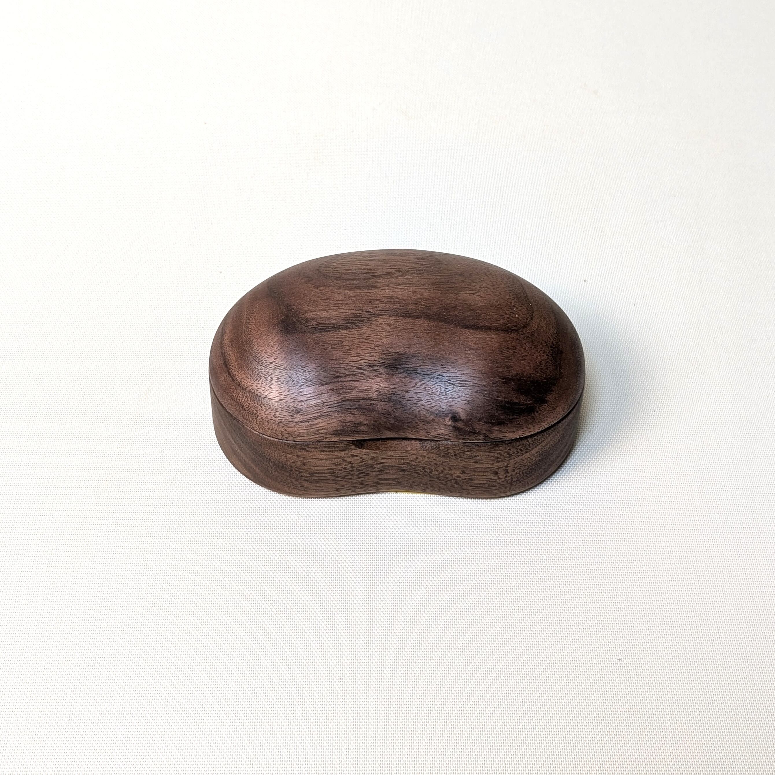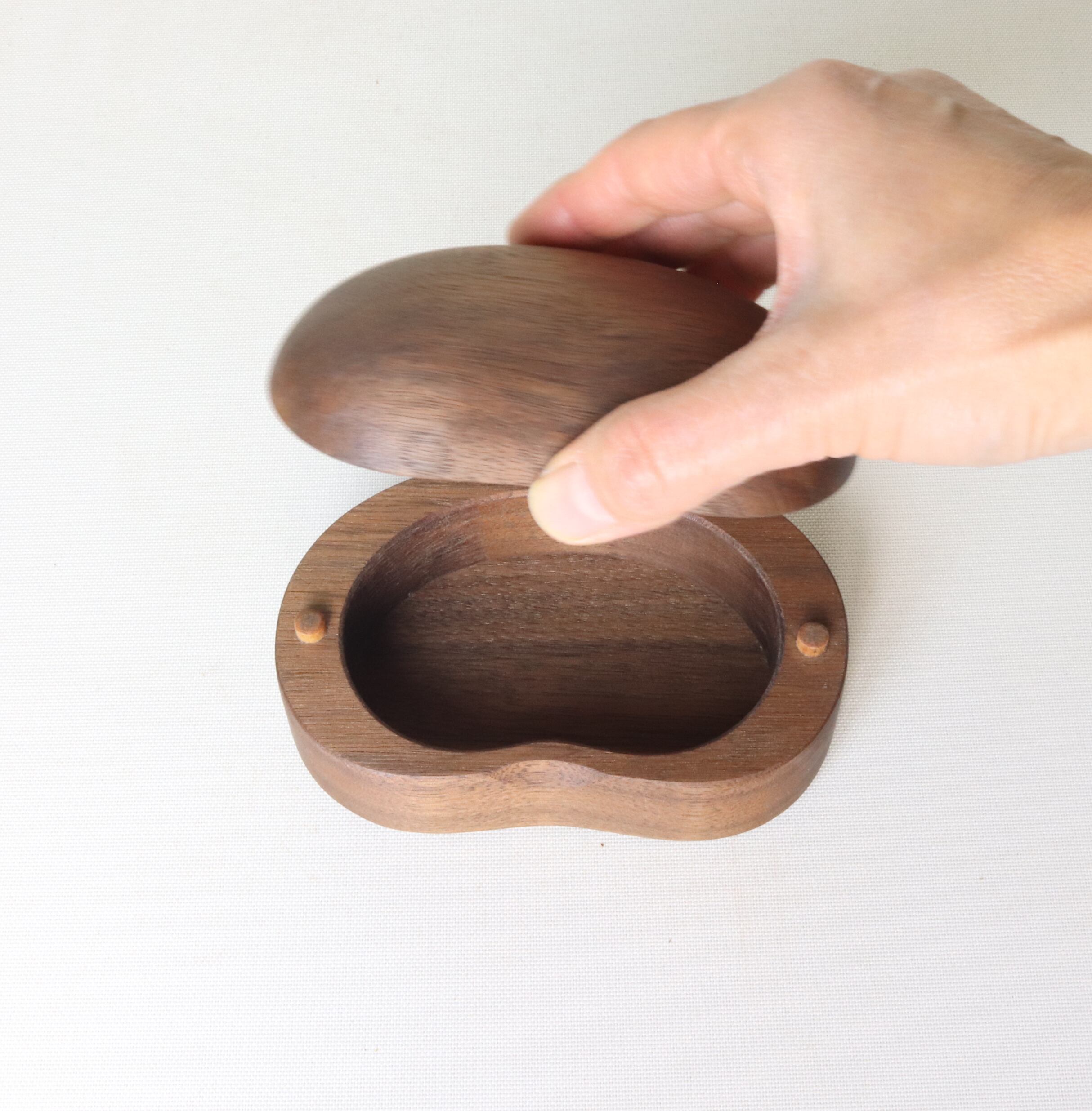 木の塊から作った豆型の小箱。柔らかい曲線が手になじみむ小物入れです。
